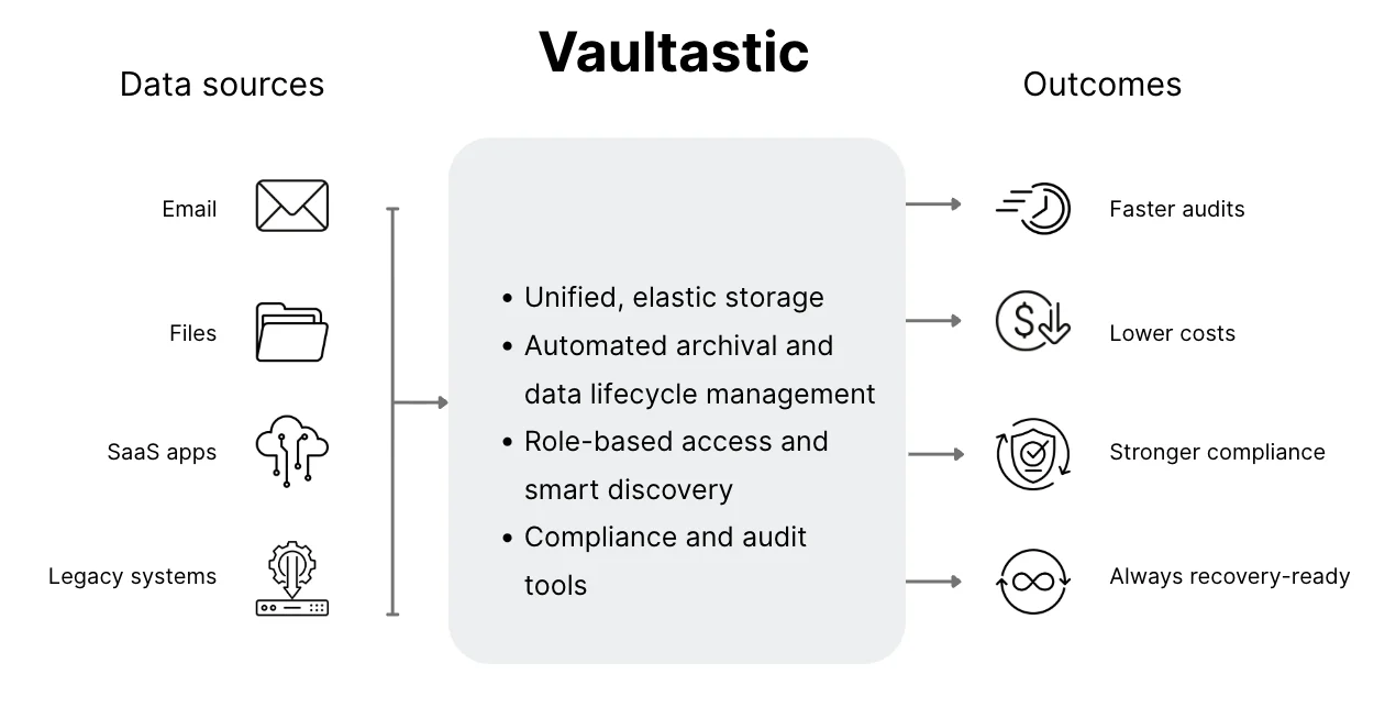 Vaultastic replaces fragmented systems and manual firefighting with a unified, intelligent foundation for data governance, compliance, and agility. Built to help you lead with confidence, not just keep up.